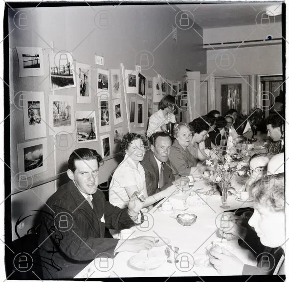 middag, människor, bord, fotografier, utställning, svartvitt, interiör, socialt, konversation, blommor, te, kaffekoppar, kläder, väggdekorationer, samling, evenemang, grupp, sittande, konst, kultur