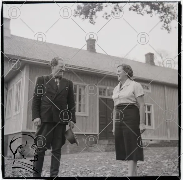 man, kvinna, hus, trä, gammal, svartvitt, kläder, leende, utomhus, 1900-tal, interaktion, traditionell, landsbygd, svensk, byggnad, fönster, dörr, hatt, kjol, skjorta, kostym, natur, träd, gräs, historia, par, porträtt, vänskap, kultur, familj