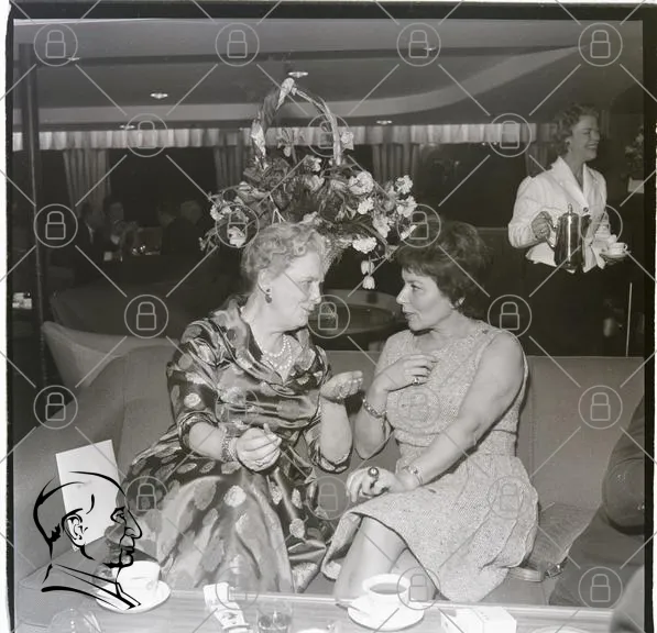 kvinnor, samtal, klänningar, fest, blommor, kaffe, 1950-tal, sällskap, eleganta, inomhus, leenden, socialt, mode, retro, svartvitt, interiör, bordsdukning, glas, te, vänskap, stil, smycken, frisyrer, atmosfär, nöje, samvaro, lyx, detaljer, bakgrund, servering