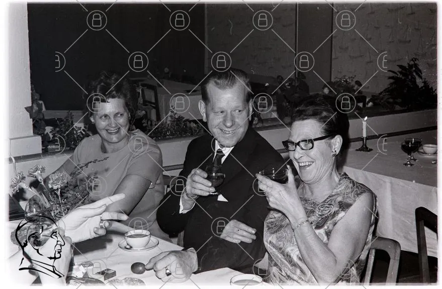 fest, människor, skratt, dryck, kläder, 1960-tal, svartvitt, bord, sällskap, leenden, glas, kaffe, socialt, samvaro, eleganta, kvinnor, män, interaktion, festligheter, minnen, gemenskap