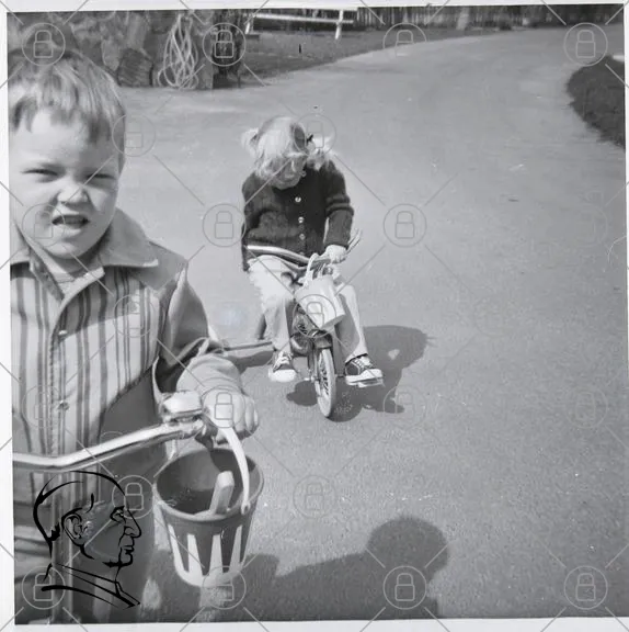 barn, cykel, lek, asfalt, utomhus, sommar, pojke, flicka, leksak, hink, svartvitt, retro, barndom, skratt, glädje, kläder, hår, cykeltur, vänner, familj, minnen, natur, väg, cykelhjul, barnlek, 1960-tal, nostalgi