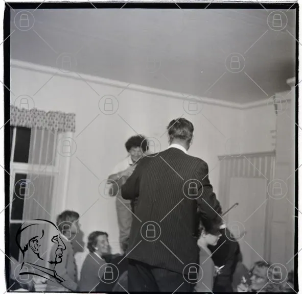 grupp, människor, inomhus, samling, man, barn, fönster, gardiner, vägg, tak, kläder, kostym, skjorta, sittande, stående, interaktion, socialt, rum, möte, familj, vänner, gemenskap, aktivitet, 1950-tal, svartvitt, retro, nostalgi, historisk, fotografi, minne