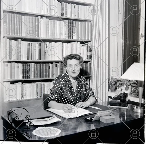 kvinna, skrivbord, böcker, bibliotek, skrivande, prickig klänning, fönster, lampa, papper, kontor, inredning, svartvitt, studier, akademisk, intellektuell, pensel, anteckningar, bokhylla, växt, tidning, dokument, fokus, porträtt, 1900-tal, stil, kreativitet, arbete, forskning, litteratur, kultur