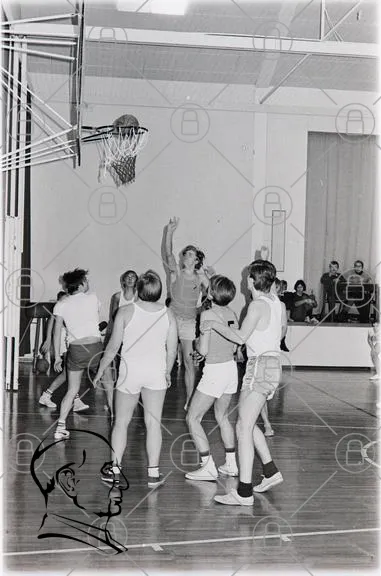 basket, sport, ungdomar, träning, inomhus, basketboll, lag, spelare, gym, aktivitet, 1970-tal, svartvitt, motion, ungdomssport, korg, skott, tävling, samarbete, gymnasie, fritid, ungdomsaktiviteter, idrott, laganda, ungdomar i rörelse, basketplan, sporthall, ungdomar som spelar