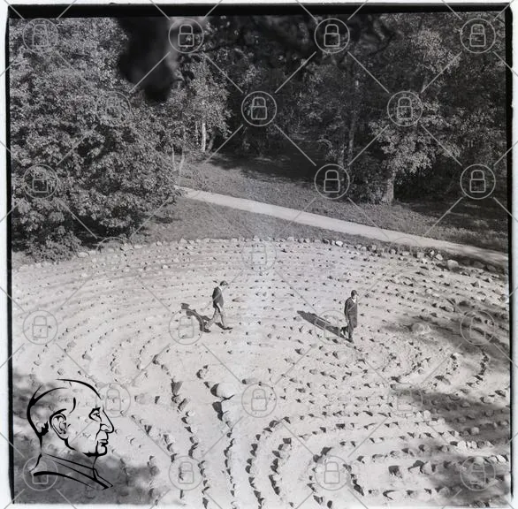 labyrint, människor, träd, natur, gångväg, stenar, svartvitt, utomhus, promenad, cirklar, mönster, landskap, stillhet, reflektion, väg, konst, design, meditation, avkoppling, park, skugga, fotografi, perspektiv, lugn, utforskning, struktur, geometri, tidlös, harmonisk, symmetri