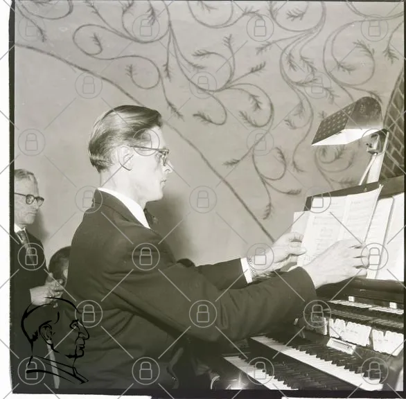 man, orgel, musik, noter, svartvitt, 1960-tal, klassisk, konsert, kläder, glasögon, inomhus, instrument, uppträdande, publik, stil, tradition, kultur, piano, komposition, dirigent
