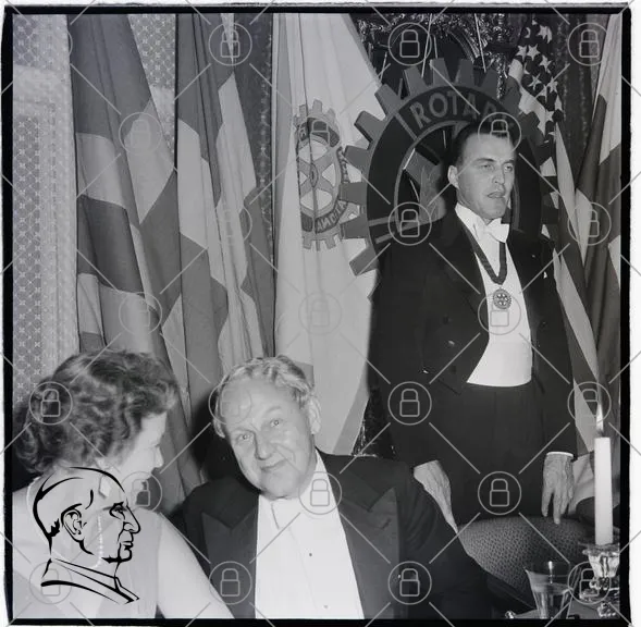 fest, middag, kläder, tuxedo, kvinna, man, flaggor, Rotary, ceremon, 1950-tal, svartvitt, sällskap, leende, bord, ljus, gala, evenemang, tradition, samling, stil, elegans