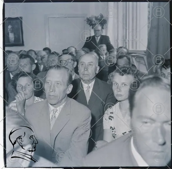 publik, möte, män, kvinnor, kläder, 1950-tal, ansikten, allvarliga, inomhus, föreläsning, samling, åhörare, bakgrund, porträtt, gammal, svartvitt, traditionell, stämning, diskussion, samhälle, historia, kultur, evenemang, gemenskap, uppmärksamhet, talare, fokus, uttryck, interaktion, minnen