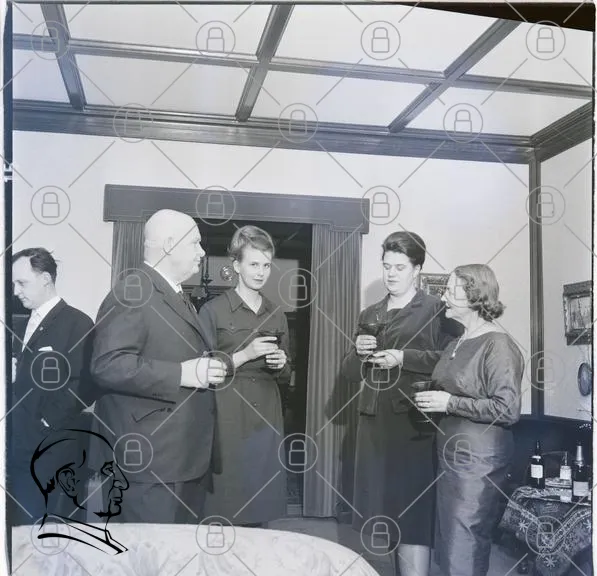 fest, människor, inomhus, kläder, drycker, 1950-tal, samvaro, leenden, möbler, rum, glas, kvinnor, män, samtal, svartvitt, socialt, tradition, interiör, stil, elegans, klänningar, kostymer, hemtrevligt, skratt, minnen, fotografi, vintage, sällskap, festligheter