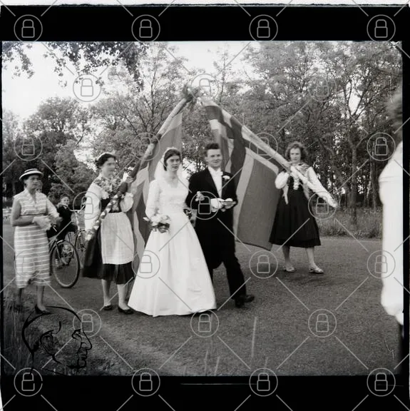 bröllop, brud, brudgum, flaggor, fest, kvinnor, cykel, klänningar, tradition, glädje, natur, väg, svartvitt, 1950-tal, firande, blommor, sällskap, kultur, ceremonin, gemenskap