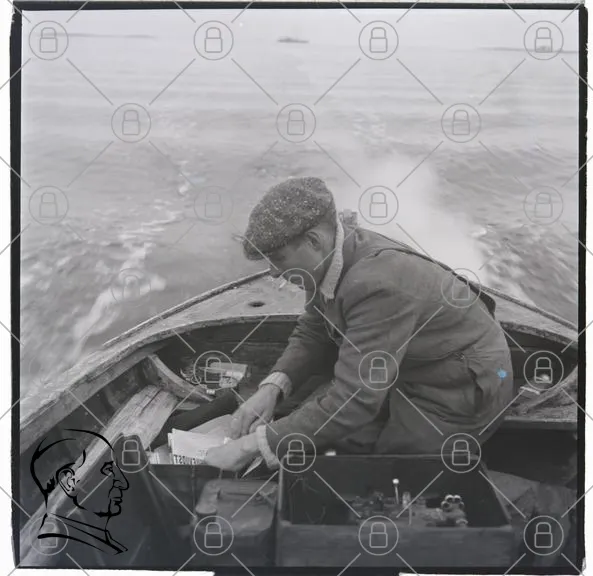 båt, man, fiske, vatten, motorbåt, skärgård, natur, hav, kläder, hatt, bok, verktyg, trä, landskap, svartvitt, traditionell, aktivitet, utomhus, ro, lugn, stillhet