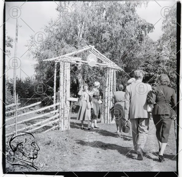 ingång, trä, staket, kvinnor, män, kläder, 1940-tal, natur, väg, skylt, grönska, promenad, gammaldags, samling, foton, svartvitt, landskap, träd, buskar, traditionell, fest, sällskap, historisk, kultur, evenemang, socialt, gemenskap, stil, vintage, landsbygd