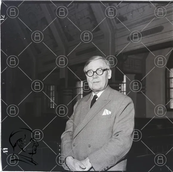 man, glasögon, kostym, inomhus, svartvitt, stående, rum, arkitektur, 1900-tal, formell, klädsel, allvarlig, interiör, belysning, historisk, fotografi, gammal, stil, traditionell, kontor, institution, kyrka, samling, person, uttryck, ansikte, professionell, elegant, klassisk, miljö