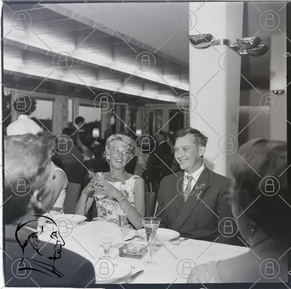 middag, fest, 1950-tal, klänning, kostym, leende, sällskap, bord, glas, dekoration, restaurang, svartvitt, elegans, socialt, festlig, mat, dryck, skratt, samtal, minnen