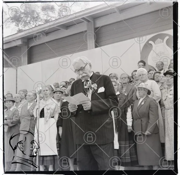 tal, man, mikrofon, publik, utomhus, äldre man, kostym, glasögon, blommor, läser, grupp, kvinnor, traditionella kläder, hattar, scen, evenemang, svartvitt, samling, kultur, ceremoni