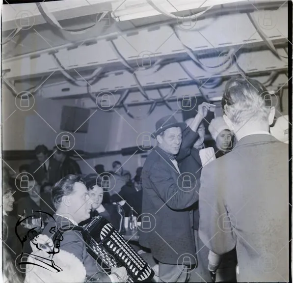 fest, dans, musik, folk, 1950-tal, svartvitt, restaurang, glädje, samvaro, kläder, hattar, ackordeon, underhållning, sällskap, festligheter, människor, socialt, tradition, kultur, nostalgisk, festlokal