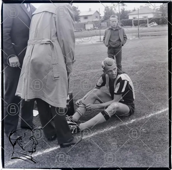 fotboll, spelare, skada, tränare, åskådare, gräsplan, sport, 1960-tal, ungdomar, match, diskussion, kläder, fotbollsskor, lag, träning, åskådare, pojke, vuxna, utomhus, aktivitet, händelse, skadad, medicinsk hjälp, sportkläder, fotbollsmatch, laganda, ungdomssport, idrott, gemenskap, fotbollsträning