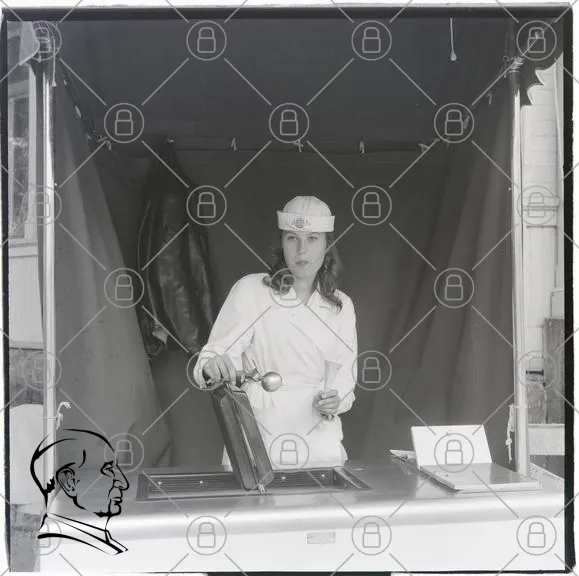kvinna, glass, kiosk, vit, kläder, hatt, skopa, servera, retro, svartvit, utomhus, stå, disk, bakgrund, klänning, professionell, leende, hand, utrustning, traditionell, sommar, nöje, mat, försäljning, service, stil, vintage, aktivitet, yrke, hantverk