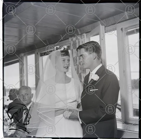 bröllop, brud, brudgum, vigsel, klänning, kostym, blommor, fest, 1950-tal, porträtt, fönster, glädje, tradition, kärlek, par, ceremonin, gäster, dekoration, fotografi, svartvitt, minnen