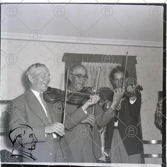 musiker, fiol, spelande, män, svartvitt, 1900-tal, inomhus, kläder, underhållning, musik, traditionell, samling, fest, leende, glasögon, rum, väggdekoration, socialt, kultur, nostalgi