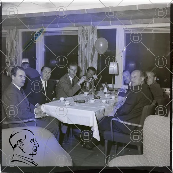 middag, män, fest, bord, kläder, ballong, fönster, mat, dryck, samtal, 1960-tal, sällskap, inomhus, stolar, dekoration, ljus, samling, skratt, vänskap, affärsmän, evenemang, socialt, firande, fotografi, svartvitt, retro, stil, elegans, tradition, gemenskap
