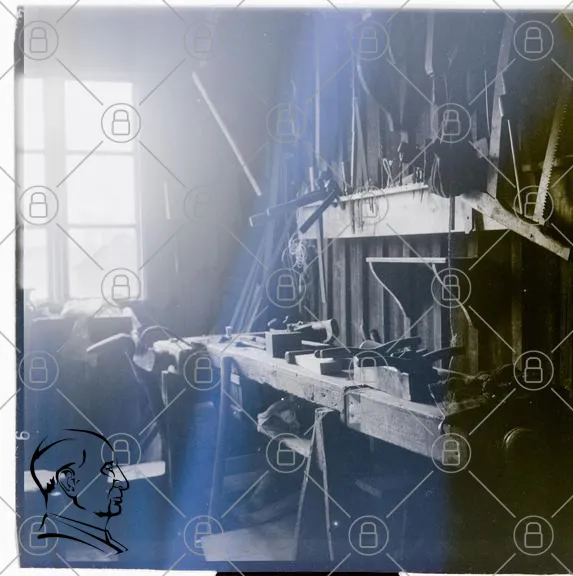 verkstad, trä, fönster, bänk, verktyg, hantverk, gammal, ljus, skugga, vägg, inredning, träbearbetning, arbetsyta, rustik, atmosfär, hantverksmaterial, gammal verkstad, industriell, kreativitet, arbetsmiljö