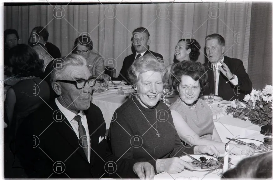 middag, fest, människor, leende, kläder, glasögon, kvinnor, män, bord, mat, 1960-tal, svartvitt, samling, sällskap, skratt, festligheter, bakgrund, dukning, samtal, nöje, tradition, socialt, evenemang, gemenskap, uttryck, glädje, minnen, fotografi, retro
