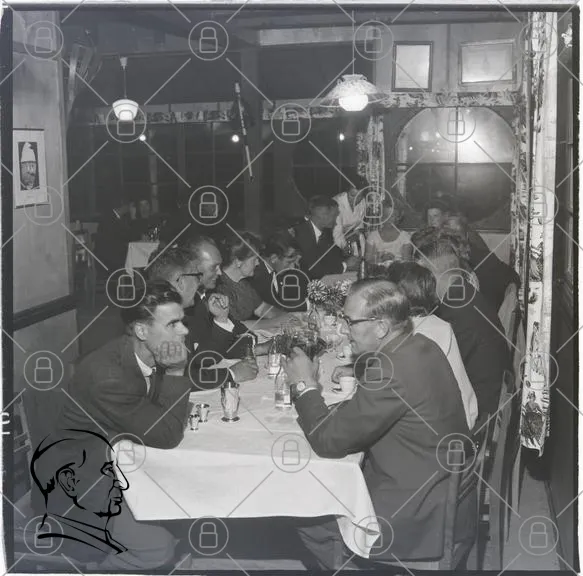 middag, fest, människor, bord, kläder, samtal, restaurang, dekoration, blommor, ljus, glas, servetter, svartvitt, 1950-tal, socialt, samling, skratt, mat, dryck, stämning, interiör, grupp, eleganta, tradition, festligheter, vänskap, gemenskap, minnen, nostalgisk