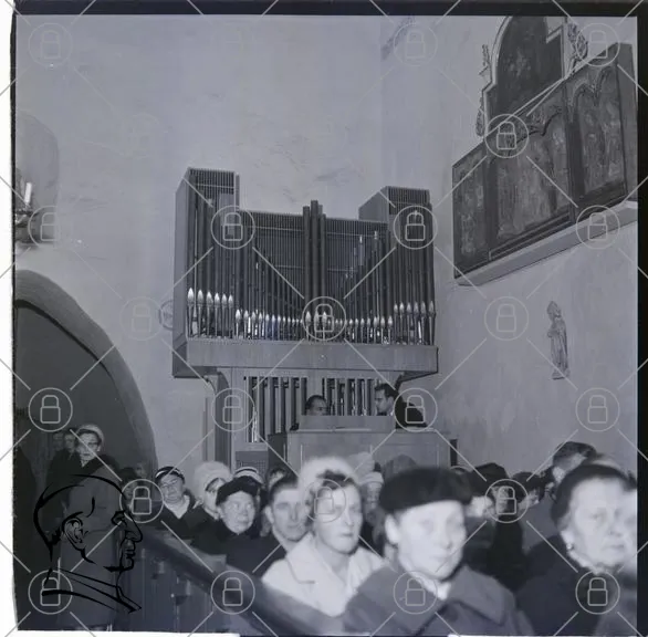 kyrka, orgel, människor, bänkar, predikstol, väggmålningar, kläder, svartvitt, samling, musik, andakt, tradition, gemenskap, kvinnor, män, inredning, ljus, stämning, historia, kultur