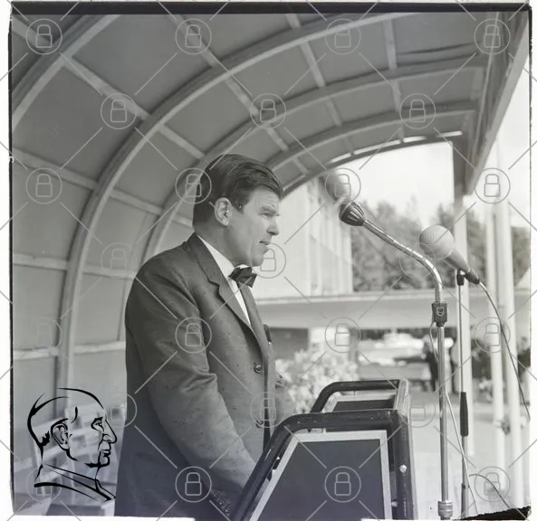 man, talare, mikrofon, scen, kostym, hatt, 1900-tal, svartvitt, publik, tal, evenemang, föreläsning, podium, kläder, uttryck, bakgrund, trä, byggnad, stolar, utomhus, samling, historia, tradition, samhälle, politik, retorik, ledarskap, kommunikation, arrangemang