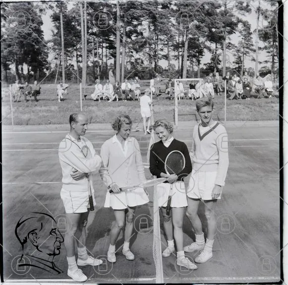 tennis, spelare, damer, herrar, racket, nät, sport, utomhus, kläder, 1900-tal, publik, gräs, match, tävling, sommar, trä, landskap, svartvitt, retro, ungdomar, aktivitet, motion, samarbete, vänskap, leenden, koncentration, förberedelse, idrott, gemenskap