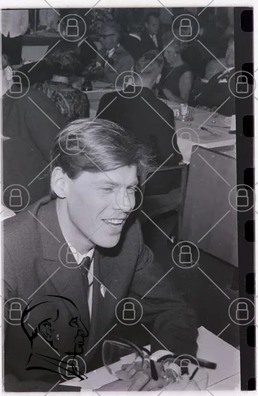 man, kostym, leende, 1960-tal, fest, svartvitt, bord, sällskap, kläder, frisyr, ungdom, porträtt, socialt, evenemang, bakgrund, sittande, uttryck, ögon, stil, accessoarer, fotografi, retro, minnen, nostalgi, samvaro, festligheter, interiör, klassisk, elegans, tidsepok