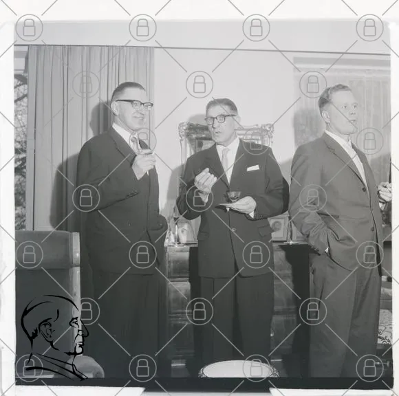 män, kostymer, glas, cigarr, 1950-tal, inomhus, möbler, svartvitt, socialt, stil, kläder, interiör, samtal, eleganta, vintage, klassiskt, fest, vänner, drinkar, sällskap