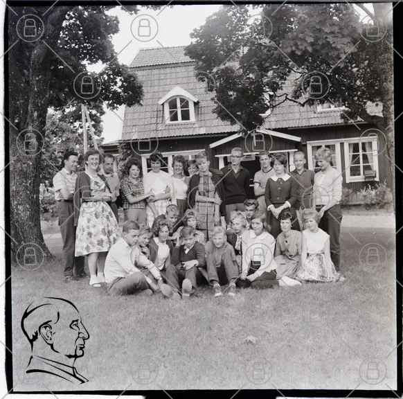 grupp, människor, utomhus, hus, träd, svartvit, foto, 1950-tal, familj, vänner, barn, ungdomar, kläder, leende, samling, sommar, tradition, minnen, glädje, natur, landskap, gemenskap, fest, fotografering, historisk, retro, socialt, samvaro, nostalgisk
