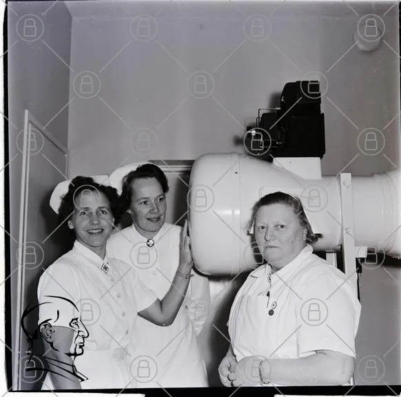 sjuksköterskor, medicinsk utrustning, röntgen, svartvitt foto, sjukhus, vårdpersonal, 1950-tal, professionella, kvinnor, medicin, teknik, hälsa, historia, sjukvård, leende, samarbete, arbetsmiljö, medicinsk historia, röntgenapparat, vård, medicinsk personal