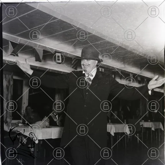 man, hatt, kostym, fest, dans, leende, bord, stolar, dekoration, svartvitt, 1900-tal, festlokal, underhållning, publik, kläder, festligheter, socialt, samling, glädje, tradition, evenemang, feststämning, gammaldags, stil, artig, gest, uttryck, interiör, belysning, festlig