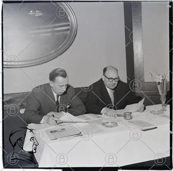 möte, män, skrivbord, papper, dokument, glas, blommor, kostymer, 1950-tal, inomhus, bord, anteckningar, diskussion, svartvitt, affärsmän, koncentration, skrivande, kontor, professionellt, formellt