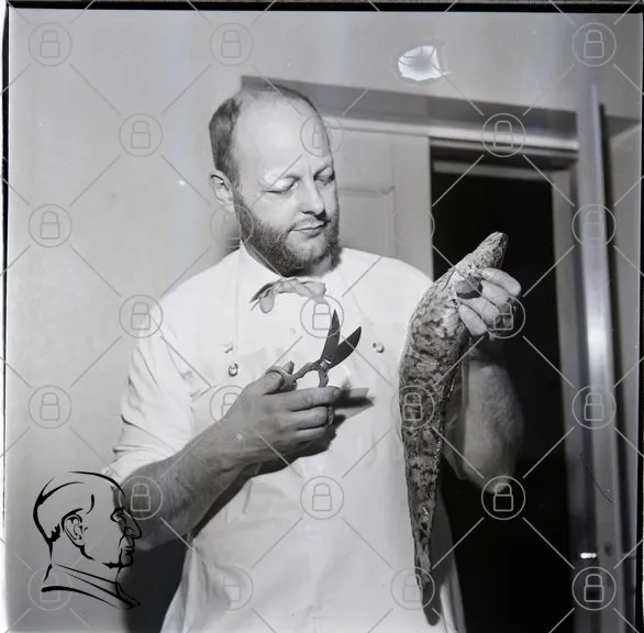 man, sax, fisk, kök, svartvitt, klippa, matlagning, hantverk, handarbete, professionell, kock, skärning, förberedelse, råvara, tradition, hantverkskonst, restaurang, köksutrustning, livsmedel, detaljer, fokus, kreativitet, yrke, manuell, noggrannhet, stil, vintage, retro, 1900-tal