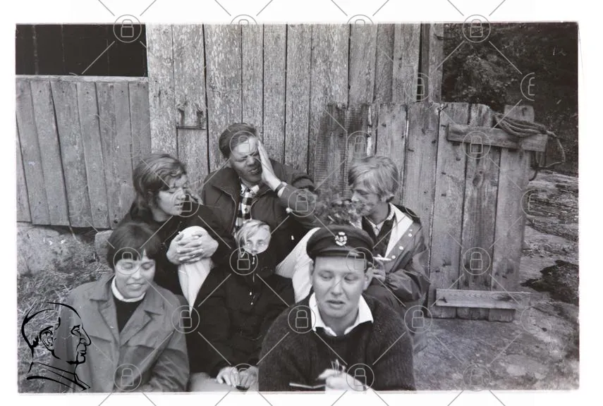 svartvit, grupp, människor, utomhus, trä, gammal, kläder, 1970-tal, porträtt, leende, barn, vuxna, traditionell, fotografi, natur, samling, ansikten, interaktion, avslappnad, minnen, historia