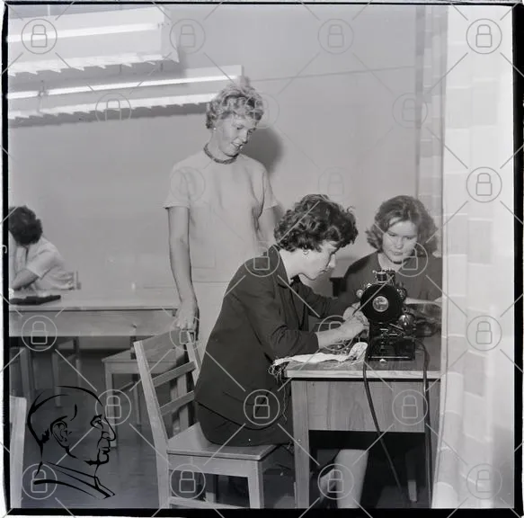 sy, kvinnor, klassrum, sömnad, lärare, elever, 1960-tal, hantverk, utbildning, maskin, bord, stolar, arbete, kreativitet, textil, fokus, samarbete, miljö, retro, svartvitt, inomhus, koncentration, lärande, tradition, handarbete, kläder, design, stil, kvinnligt, gemenskap