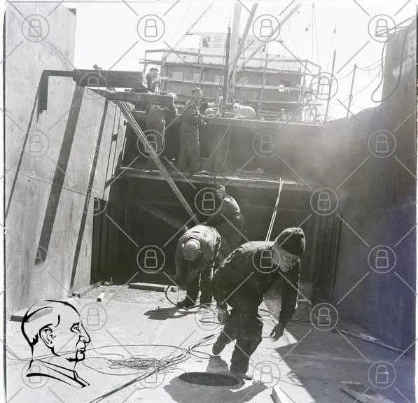 arbetare, skepp, byggarbetsplats, industri, verktyg, konstruktion, lastning, fartyg, metall, svetsning, maskiner, säkerhet, teamwork, 1950-tal, hamn, arbete, män, arbetskläder, projekt, teknik, byggmaterial