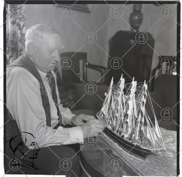 man, modellbåt, segelbåt, inomhus, hobby, trä, detaljer, hantverk, sittande, möbler, vintage, svartvitt, fokus, handarbete, maritim, nostalgi, konst, skapande, interiör, 1900-tal