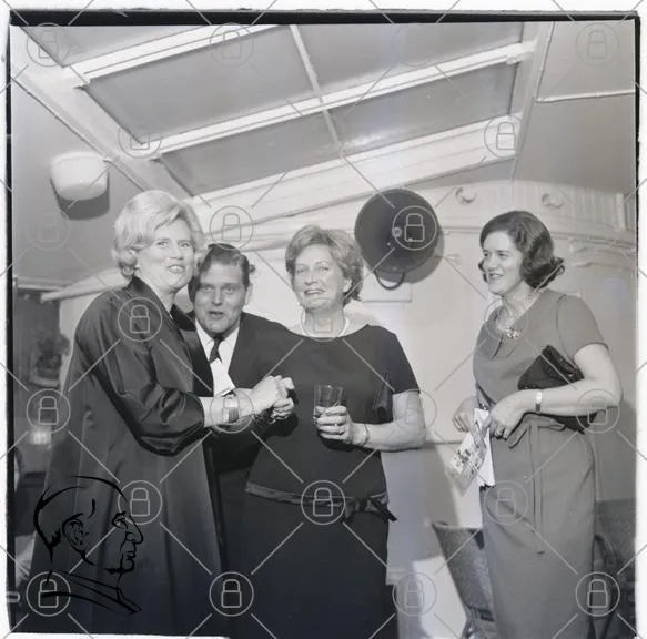fest, kvinnor, män, klänningar, svartvitt, 1960-tal, socialt, samvaro, leenden, eleganta, interiör, båt, sällskap, mode, vintage, glas, skratt, samtal, stil, kläder, festligheter, minnen, nostalgi, vänskap, evenemang, samling, atmosfär, glädje, tradition, kultur