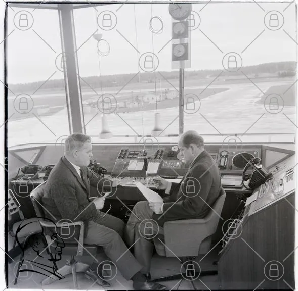 flygkontroll, torn, samtal, piloter, flygplats, teknik, kommunikation, övervakning, säkerhet, luftfart, 1960-tal, svartvitt, professionell, dokument, mätinstrument, fönster, utsikt, arbete, män, kontor, lufttrafik, plan, kontrollpanel, möte, skrivande, observation, miljö, inomhus, station