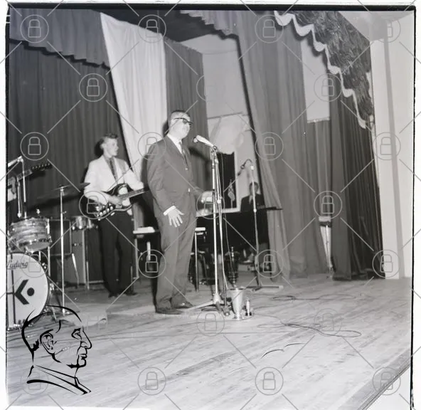 scen, mikrofon, talare, musiker, band, trummor, gitarr, piano, svartvitt, 1960-tal, underhållning, publik, kläder, man, kvinna, musik, föreställning, kultur, evenemang, artist, scenkonst