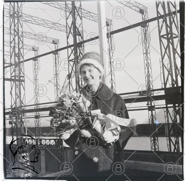 kvinna, blommor, hatt, byggarbetsplats, svartvit, leende, klänning, konstruktion, 1900-tal, porträtt, stålstruktur, festlig, bukett, fotografering, historisk, arkitektur, industri, kvinna med blommor, utomhus, firande