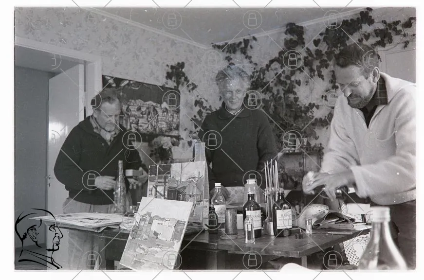 målning, konstnärer, flaskor, bord, svartvitt, inomhus, väggkonst, växter, 1950-tal, samarbete, kreativitet, konstverk, stillhet, hantverk, tradition, grupp, män, konstnärsmaterial, skisser, ateljé, vintage, retro, kultur, gemenskap, arbete, inspiration, fotografi, historia, konstnärsliv, detaljer