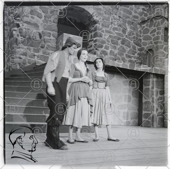 teater, skådespelare, kostymer, scen, svartvitt, dramatiskt, föreställning, kläder, kvinnor, män, trätrappa, stenhus, 1900-tal, teaterproduktion, uttryck, performance