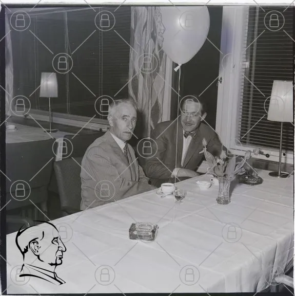 män, fest, ballong, bord, duk, lampor, glas, kaffe, blommor, svartvitt, kläder, 1950-tal, sällskap, inomhus, stolar, dekorationer, firande, ansikten, uttryck, samvaro