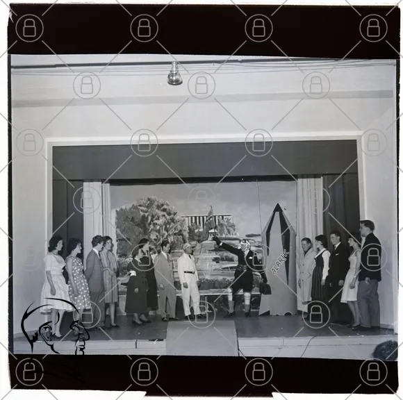 teater, scen, skådespelare, kostymer, 1940-tal, svartvitt, föreställning, publik, bakgrund, kläder, drama, uppträdande, grupp, kvinnor, män, rekvisita, ljus, kultur, konst, tradition, underhållning, historisk, samhälle, gemenskap, evenemang, scenografi, uttryck, samarbete, kreativitet, presentation